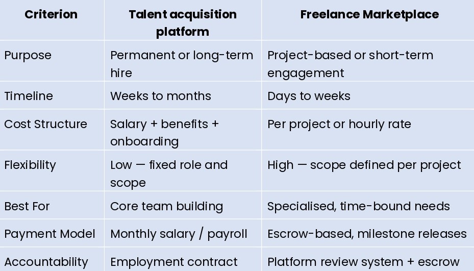 Can a freelance platform replace a talent acquisition strategy entirely? — No. This is the core of recruitment vs freelancing: both serve distinct needs. Permanent team building still requires traditional hiring; freelance platforms excel at fixed-scope outcomes.